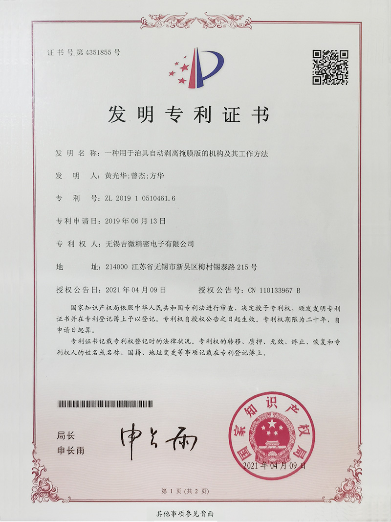 一種用于治具自動剝離掩膜版的機構及其工作方法發(fā)明專利證書